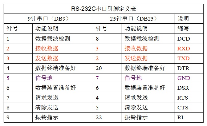 2. RS232C 接口定义RS232C并未定义连接器的物理特性,不同类型的连接器引脚定义也各不相同,其中9针和25针的引脚定义对照,如图 1 所示。